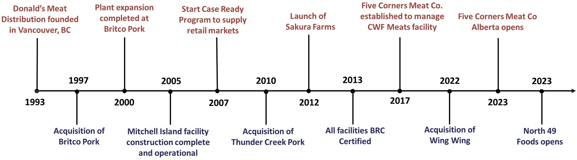 A major milestone was achieved towards the end of 2023 as we grew to six locations with over 1100 team members. We also established our first site in the province of Alberta. We opened Five Corners Meats Co. in Edmonton to produce more case ready products for our customers. During the same period, we opened North 49 Foods, our largest site to date, in Moose Jaw, Saskatchewan to process sows for our producers and for further growth opportunities.